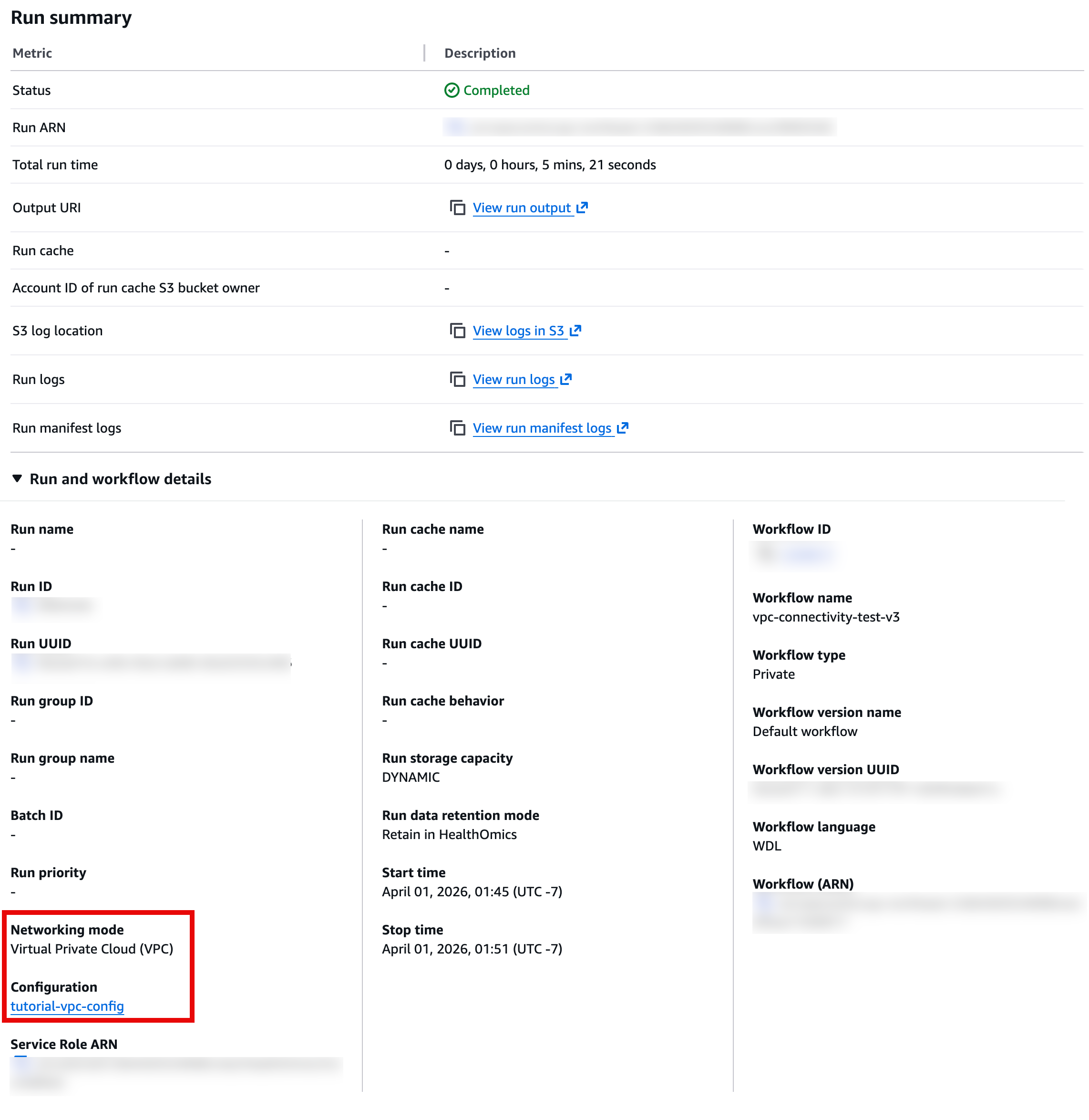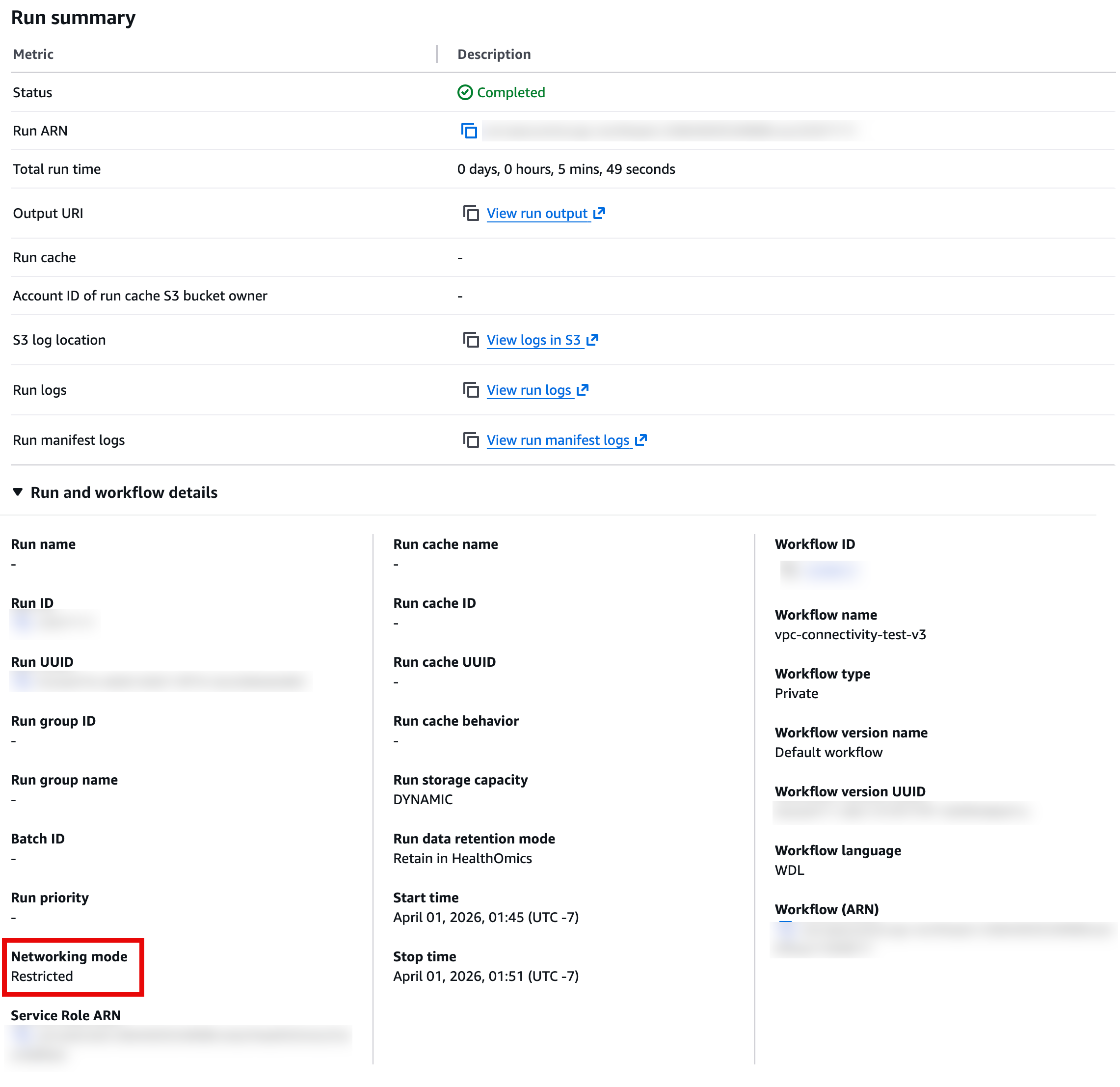 RESTRICTED 모드로 실행한 경우, Networking mode 항목에 Restricted로 표시됩니다. Configuration 항목은 표시되지 않으며, 워크플로우는 HealthOmics의 기본 네트워크 환경에서 실행됩니다. 같은 리전의 S3와 ECR만 접근 가능하고, 외부 인터넷 연결은 불가합니다.